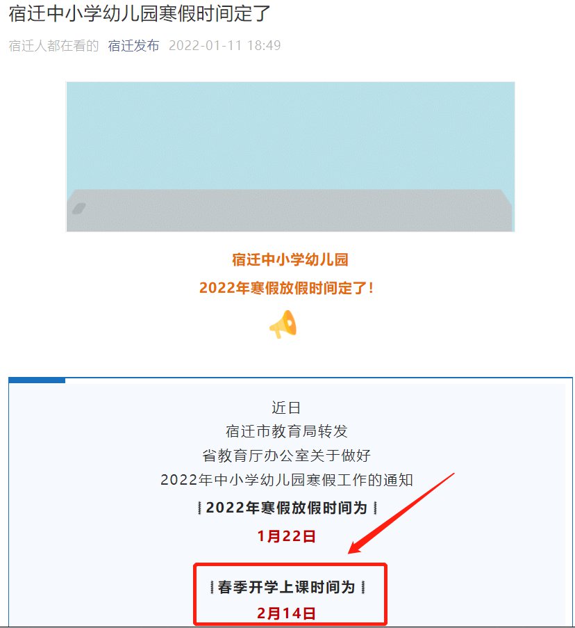 2022年1月11日,由宿迁发布发布的宿迁中小学幼儿园寒假时间可知: