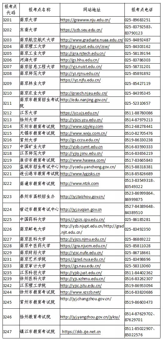 2022年江苏省硕士研究生招生考试报考点网址和咨询电话如下表: