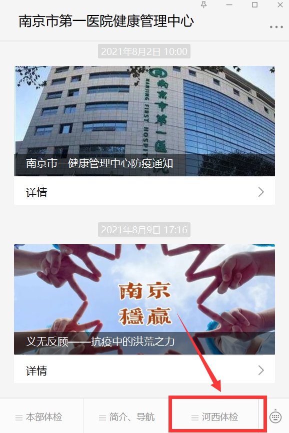 2、进入“南京市第一医院健康管理中心”微信公众号,点击右下角“河西体检”进行预约缴费并按预约时间进行体检。