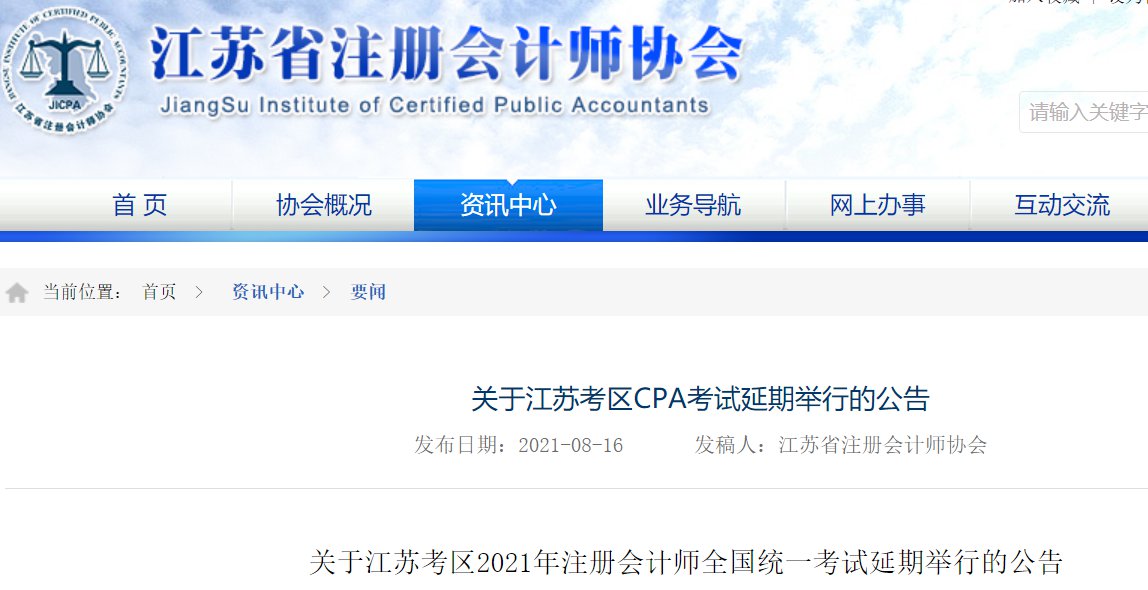 为切实保障各位考生的身体健康和生命安全,根据当前我省疫情防控工作的要求,经江苏省财政厅注册会计师考试委员会研究,报请上级有关部门批准,原定于2021年8月27日至29日举行的江苏考区注册会计师全国统一考试延期举行,具体时间另行通知。