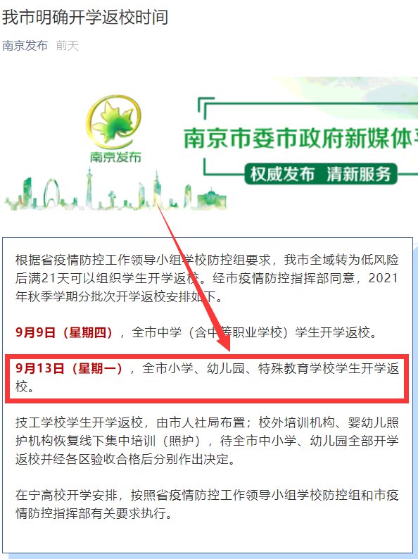 2021年9月13日(星期一),南京全市小学、幼儿园、特殊教育学校学生开学返校。