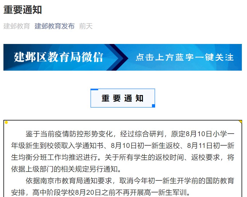 鉴于当前疫情防控形势变化,经过综合研判,南京市建邺区原定2021年8月10日初中一年级新生到校领取入学通知书的工作推迟。