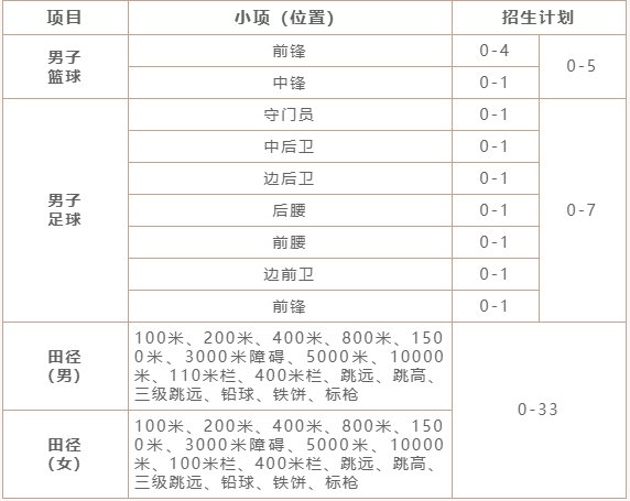 男女田径:获得国家一级运动员及以上证书且高中阶段获得省级比赛前3名或全国比赛前8名;获得国家二级运动员且高中阶段获得省级比赛前3名。