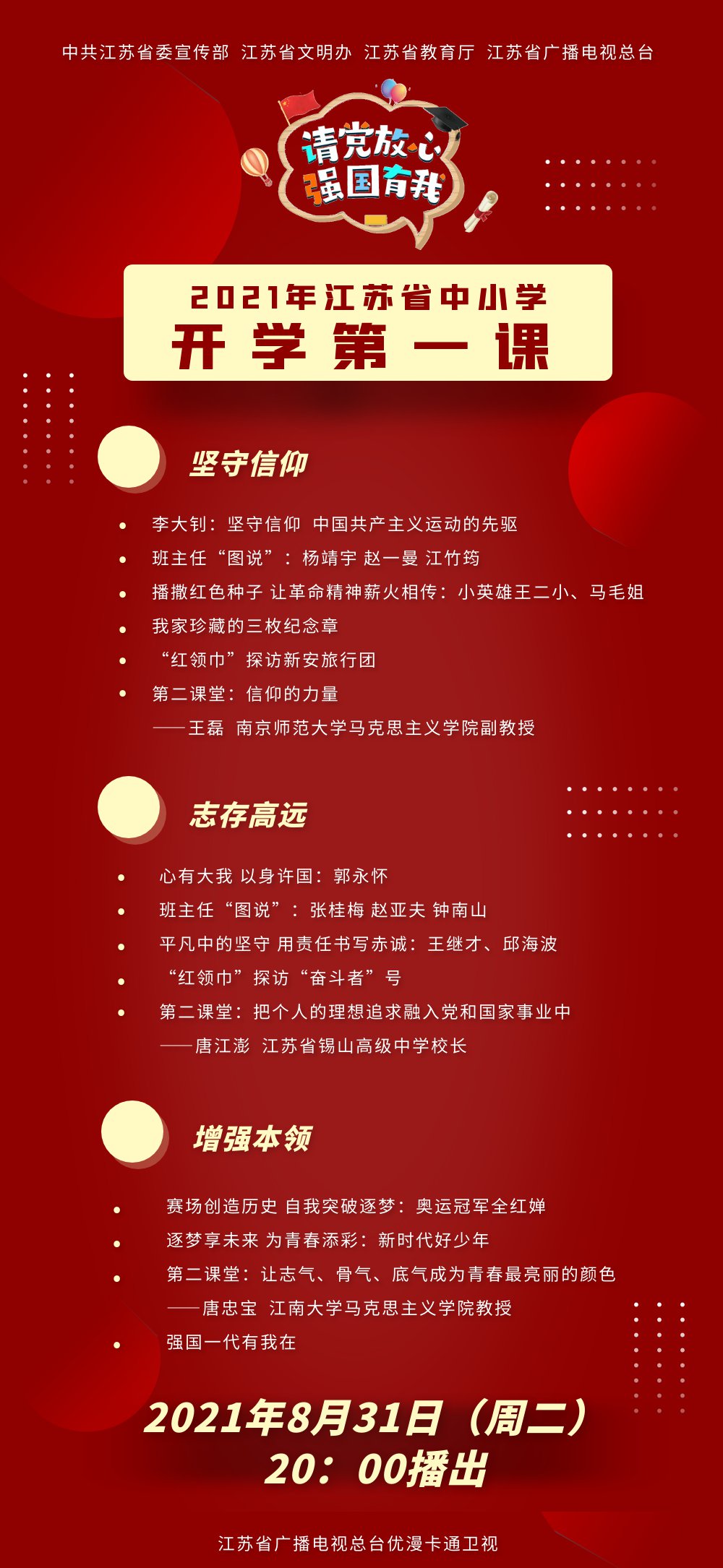 2021年江苏省以“请党放心 强国有我”为主题的开学第一课于2021年8月31日20:00准时开播!