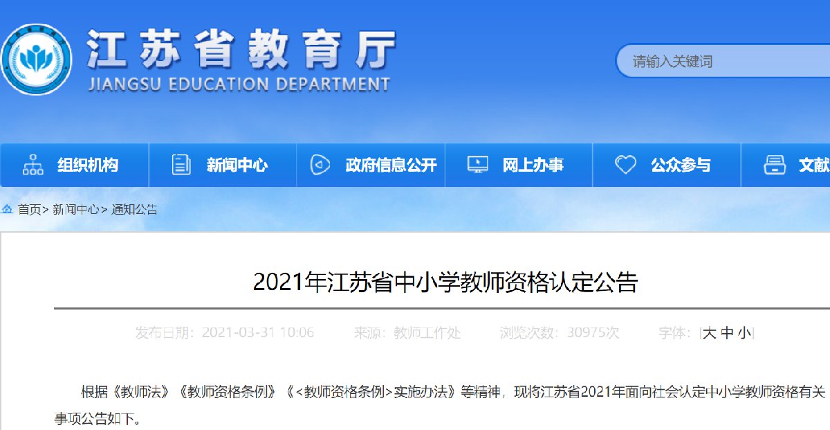 2021年下半年江苏省中小学教师资格认定网报时间为8月23日至9月6日。
