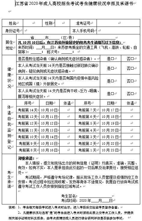 江苏2020年成考考生健康状况申报及承诺书(附下载入口)