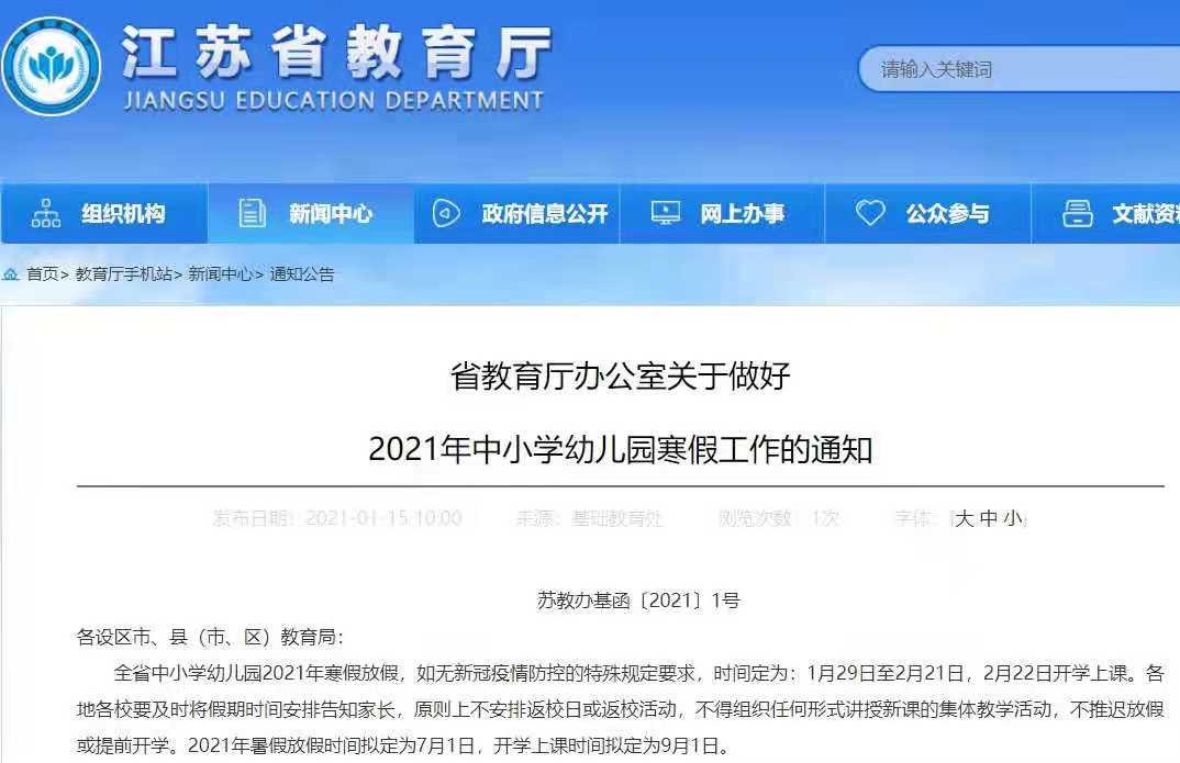 江苏省教育厅于2021年发布的《省教育厅办公室关于做好2021年中小学幼儿园寒假工作的通知》: