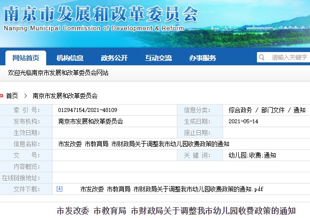江北新区市场监管局、教育和社会保障局,各区发改委、教育局、财政局,各有关单位:为保障我市普惠性幼儿园健康可持续发展,建立合理成本分担机制,改善办园条件,提升办园质量,满足人民群众对高质量学前教育的需求,根据《省物价局关于印发〈江苏省定价目录〉的通知》(苏价规〔201710号)《省物价局省教育厅省财政厅关于印发〈江苏省幼儿园收费管理办法的通知》(苏价规〔2017〕9号)《省物价局省教育厅省人力资源和社会保障厅关于推进民办教育收费改革的指导意见》(苏价费〔2018〕69号)等文件规定,结合我市实际,经市政府同意,现就调整我市幼儿园收费政策有关事项通知如下: