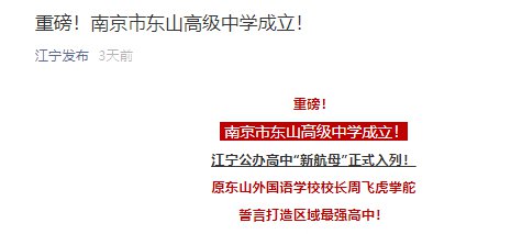 南京市东山外国语学校停止招收高一年级新生,高二年级、高三年级学生继续在原校址就读,由南京市东山高级中学统一管理。