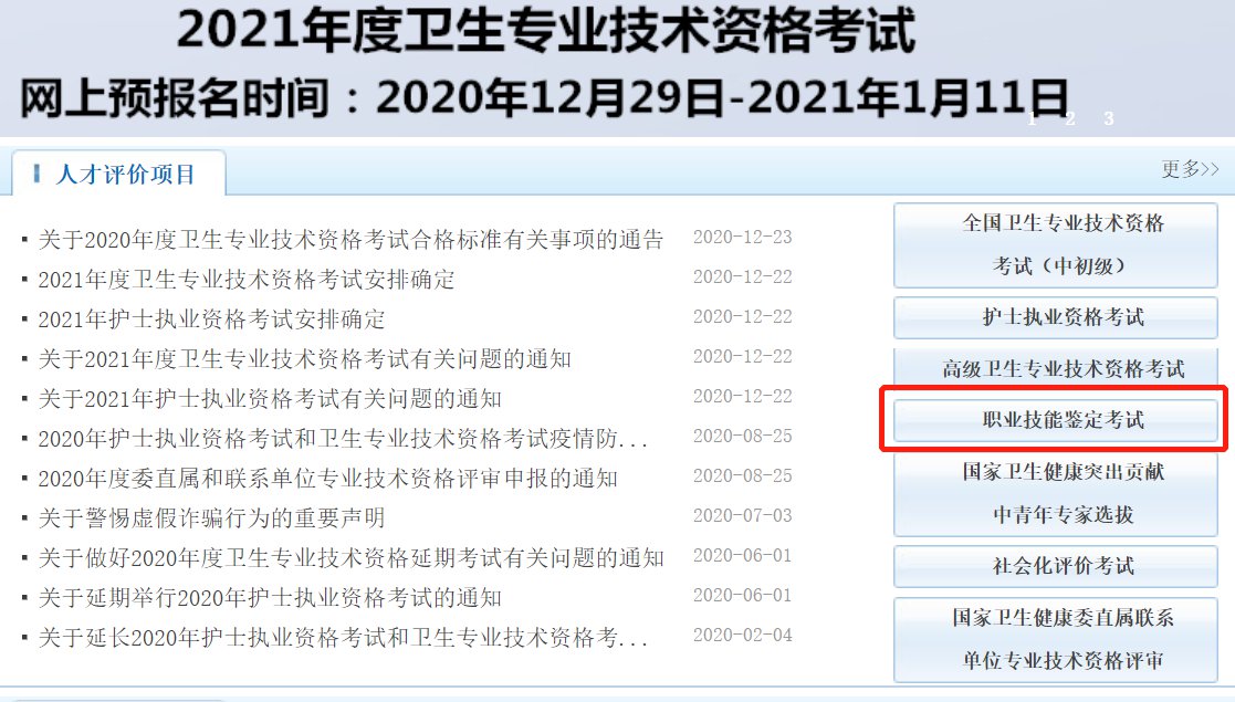 打开中国卫生人才网(http://m.nj.bendibao.com/edu/www.21wecan.com),进入网站后,找到第一屏的右下位置,点击【职业技能鉴定考试】。