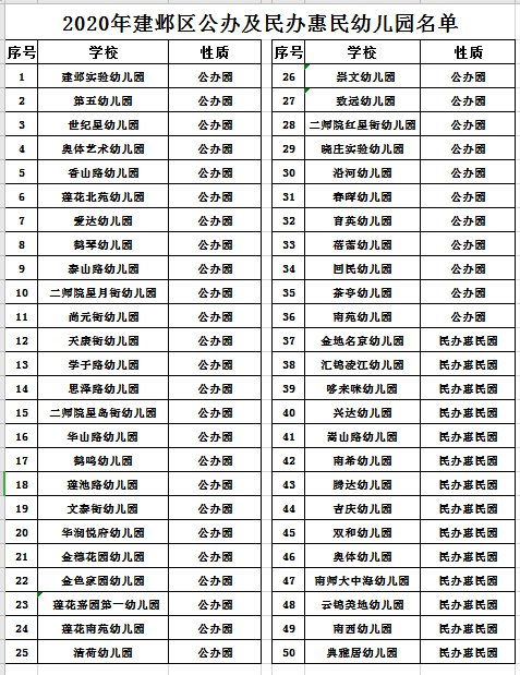 建邺实验幼儿园、第五幼儿园、世纪星幼儿园、奥体艺术幼儿园、香山路幼儿园、莲花北苑幼儿园、爱达幼儿园、鹤琴幼儿园、泰山路幼儿园、二师院星月街幼儿园、尚元街幼儿园、天康街幼儿园、学子路幼儿园、思泽路幼儿园、二师院星岛街幼儿园、华山路幼儿园、鹤鸣幼儿园、莲池路幼儿园、文泰街幼儿园、华润悦府幼儿园、金穗花园幼儿园、金色家园幼儿园、莲花嘉园第一幼儿园、莲花南苑幼儿园、清荷幼儿园、崇文幼儿园、致远幼儿园、二师院红星街幼儿园、晓庄实验幼儿园、沿河幼儿园、春晖幼儿园、育英幼儿园、蓓蓄幼儿园、回民幼儿园、茶亭幼儿园、南苑幼儿园。