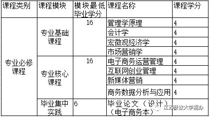 专业必修课程包含专业基础课程、专业核心课程和毕业集中实践,专业课程主要培养学生具备较丰富的电子商务专业理论知识,相对系统的管理学、营销学等知识。具备比较扎实的电子商务专业技能和动手能力,兼具一定经济分析和决策的能力。