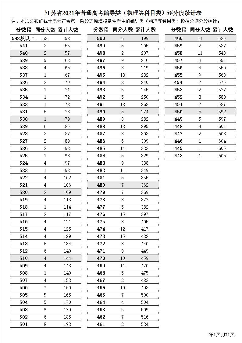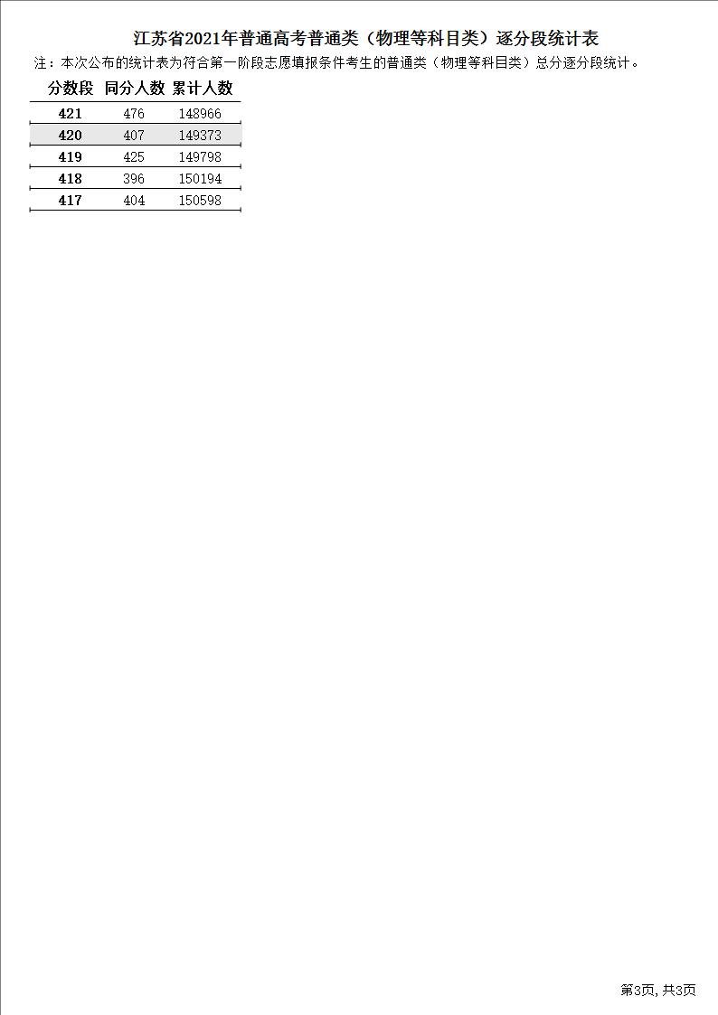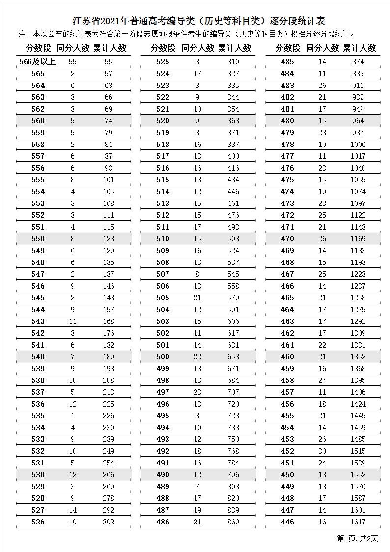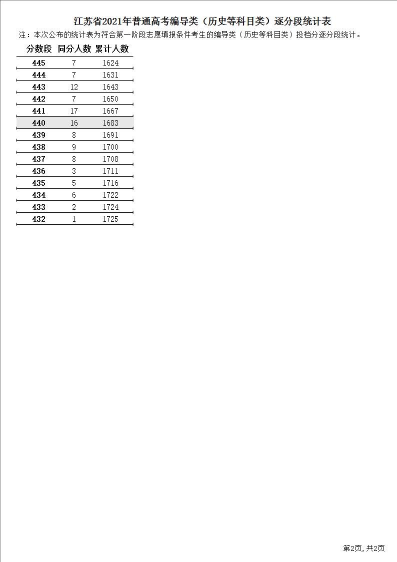 江苏省2021年普通高考逐分段统计表 江苏省2021年高考分数段统计