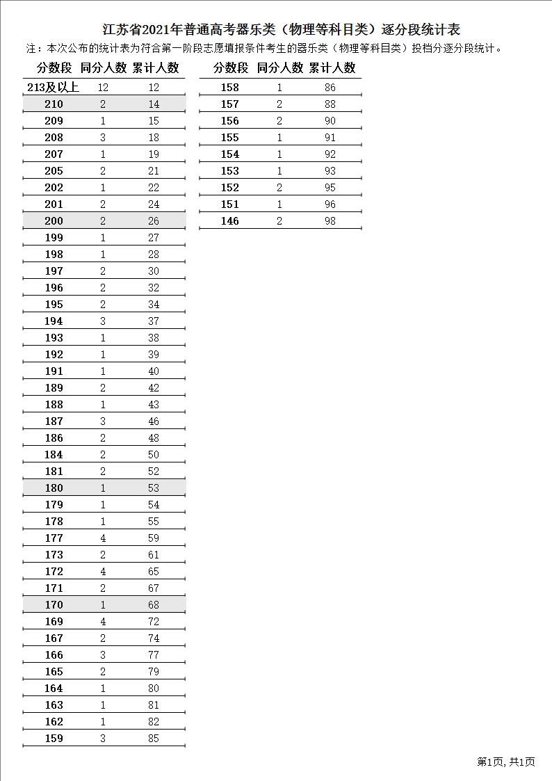 ▶江苏省2021年普通高考声乐类(物理等科目类)逐分段统计表