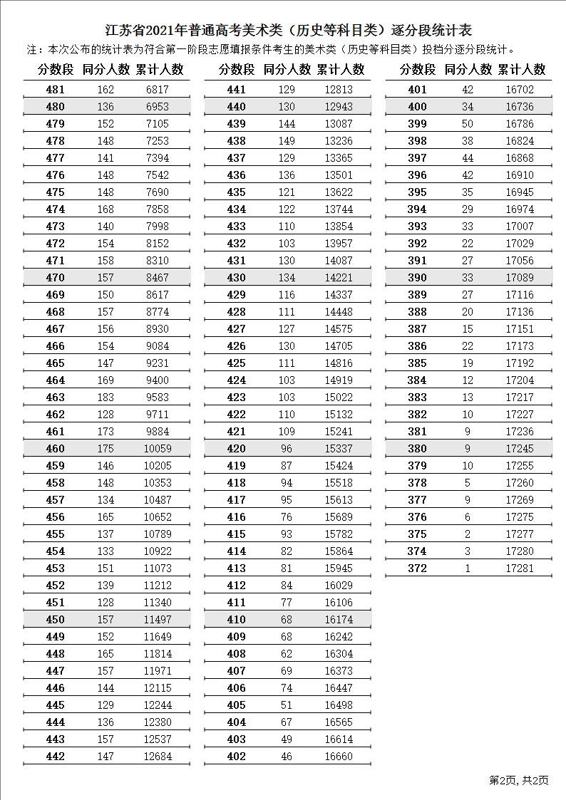 ▶江苏省2021年普通高考美术类(历史等科目类)逐分段统计表
