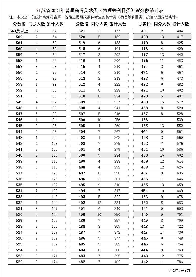 ▶江苏省2021年普通高考美术类(物理等科目类)逐分段统计表