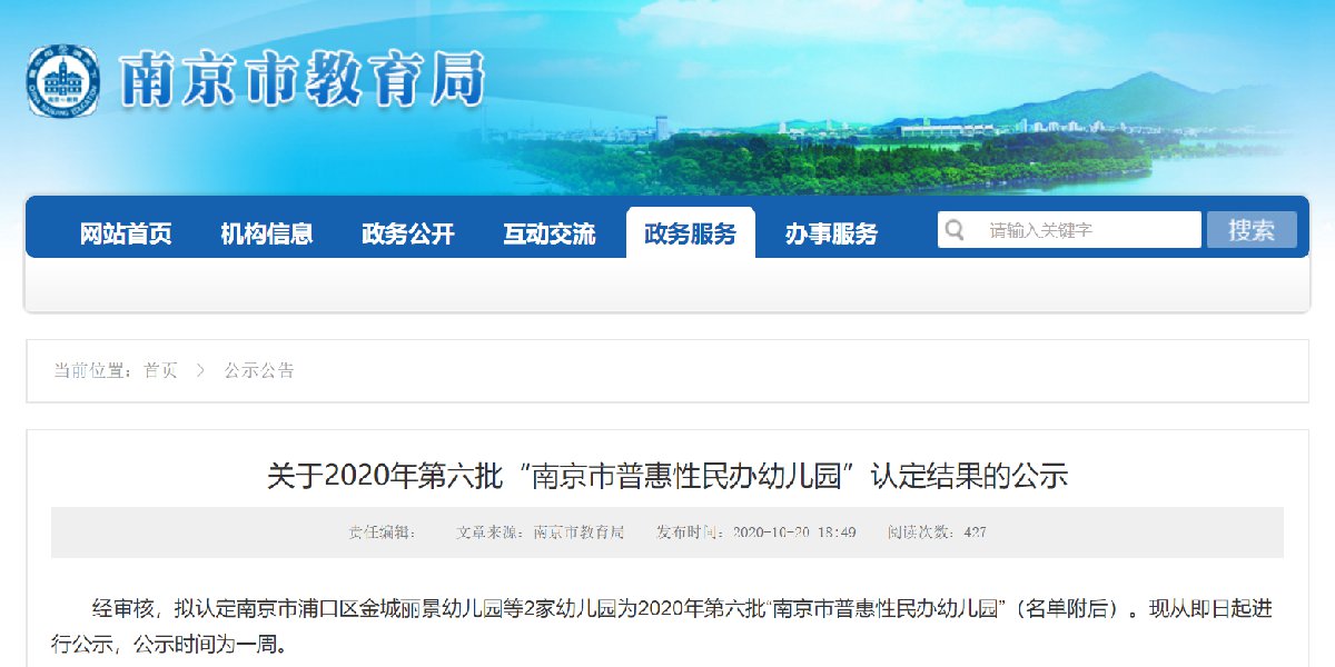 2020年10月20日,南京市教育局公布了关于2020年第六批“南京市普惠性民办幼儿园”认定结果的公示。