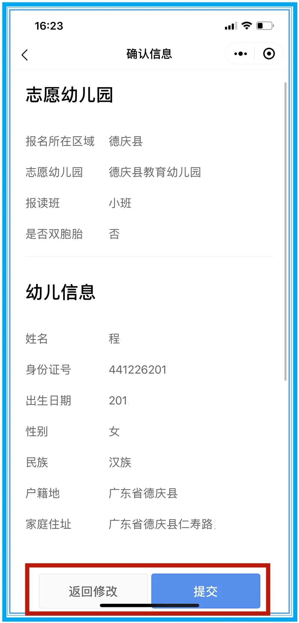 第九步:信息确认,若需调整,点“返回修改”,确认无误后,点“提交”,报名成功。