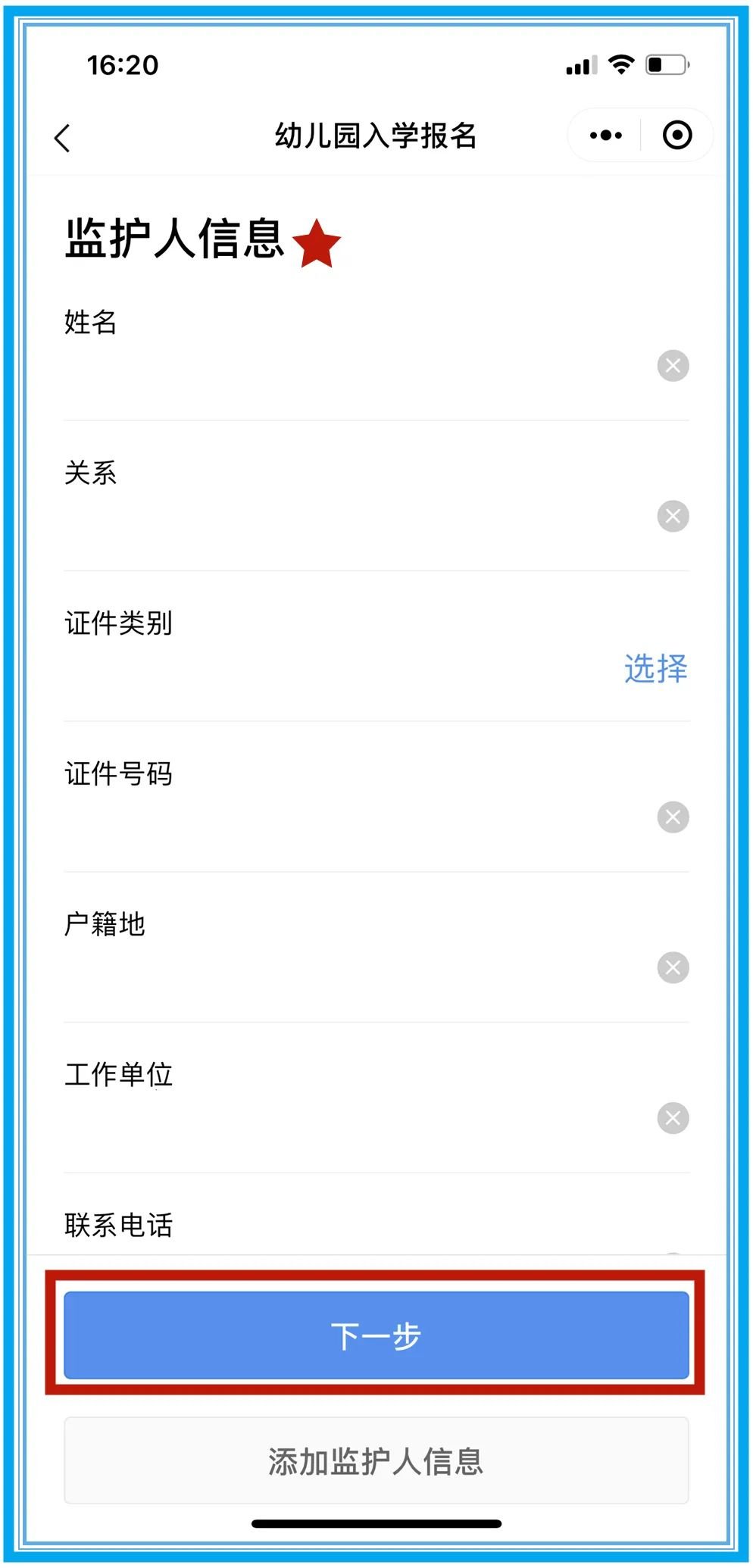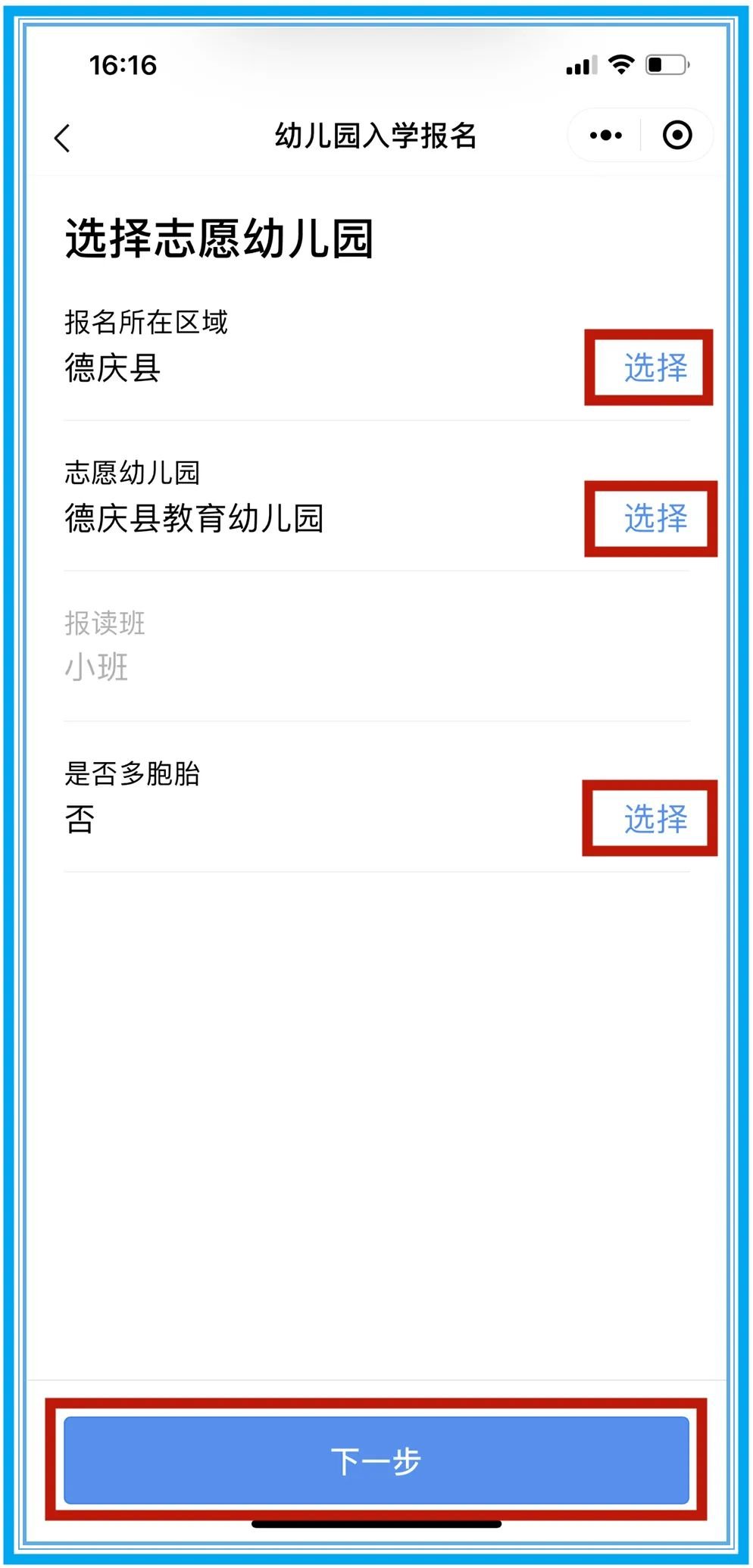第六步:选择“志愿幼儿园和是否多胞胎”(报名所在区域务必选择“德庆县”),然后点击“下一步”。