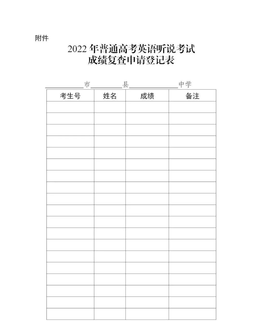 附件:2022年普通高考英语听说考试成绩复查申请登记表