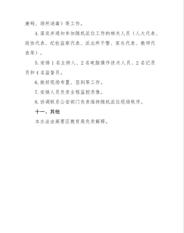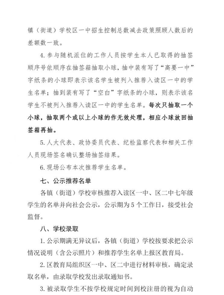 3.随机派位以镇(街道)学校为单位,由人大代表、政协委员代表、纪检监察代表、学生家长代表、校长代表、教师代表、区教育局人员、初级中学人员等成员组成工作小组,通过随机派位方法确定本镇(街道)学校推荐入读区一中、区二中七年级学生名单,额满即止。