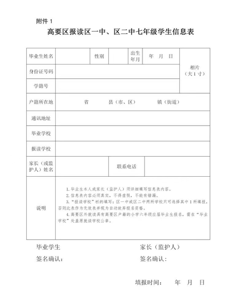 (二)在高要区外就读具有高要区户籍的小学毕业生,如符合条件并自愿申请报读区一中、区二中七年级的,须回本人户籍所属镇(街道)设立的报名点报名,填写并提交《高要区报读区一中、区二中七年级学生信息表》(需原就读学校盖公章),同时提交学生本人户口簿复印件、学籍信息表等资料。
