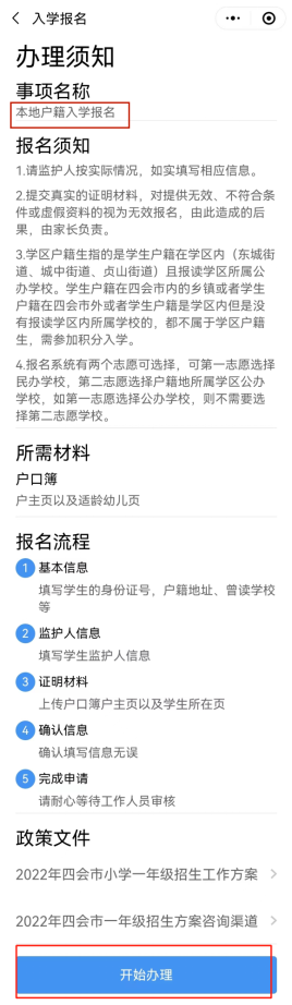(二)选择“四会市”——根据学生是否为本地学区户籍选择“本地户籍学生报名”或“积分入学报名”,阅读《报名须知》后,点击“开始办理”。(期间需要通过人脸识别或者微信支付码验证,实名登录)