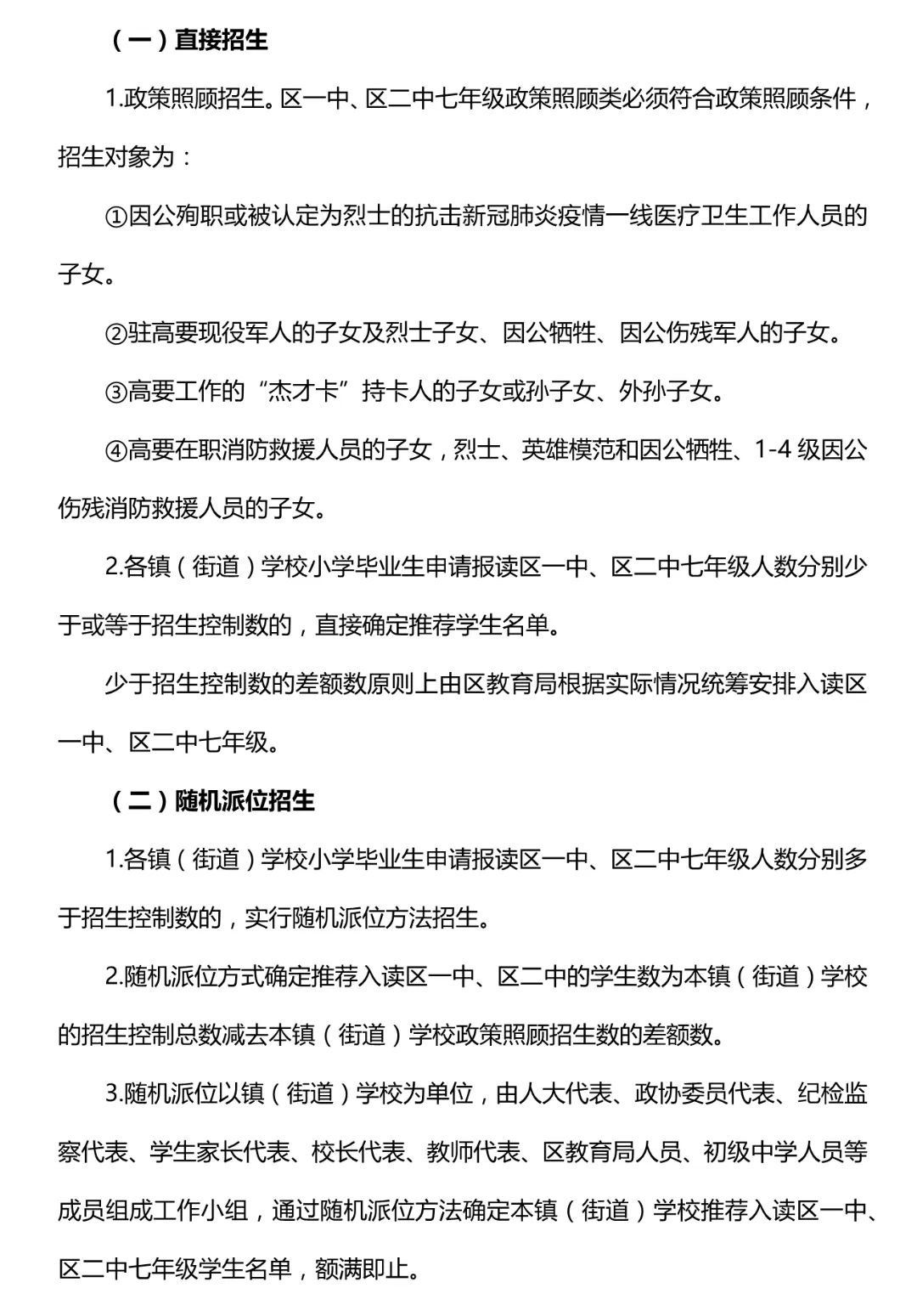 2、随机派位方式确定推荐入读区一中、区二中的学生数为本镇(街道)学校的招生控制总数减去本镇(街道)学校政策照顾招生数的差额数。