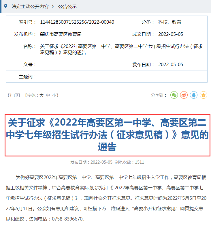 肇庆高要一中、二中七年级招生计划通告