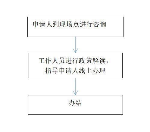 1、咨询。申请人到现场点进行咨询,工作人员进行政策解读,指导申请人线上办理。