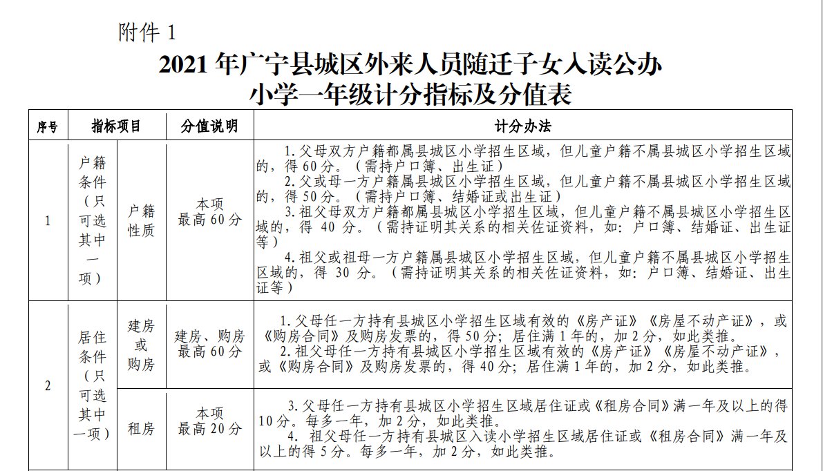 1.2021 年广宁县城区外来人员随迁子女入读公办小学一年级计分指标及分值表