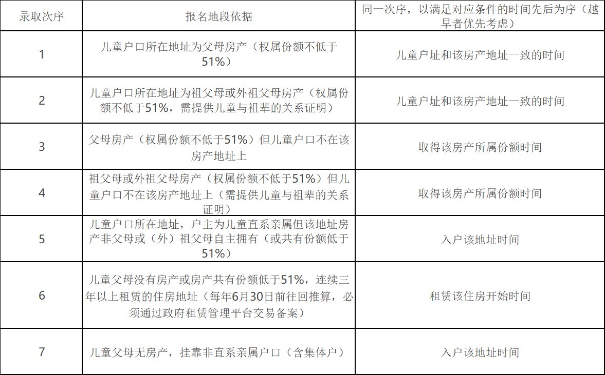 特别说明:1.部分儿童可能同时符合以上不止一个次序依据,家长可根据实际情况选择其一作为报名依据,风险由家长自担。2.户籍确认以取得正式户口簿为准,房产确认以取得正式产权为准,而非申请或办理过程中的时间。3..有关房产必须为住宅用途,商业用公寓、商铺、车位、写字楼或其他用途等不作为地段依据。