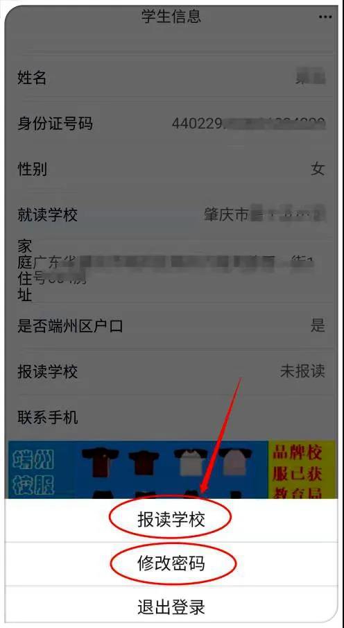 4、屏幕下方显示操作菜单,可以直接点击“报读学校”或“修改密码”(需修改密码后则需重新登录)。
