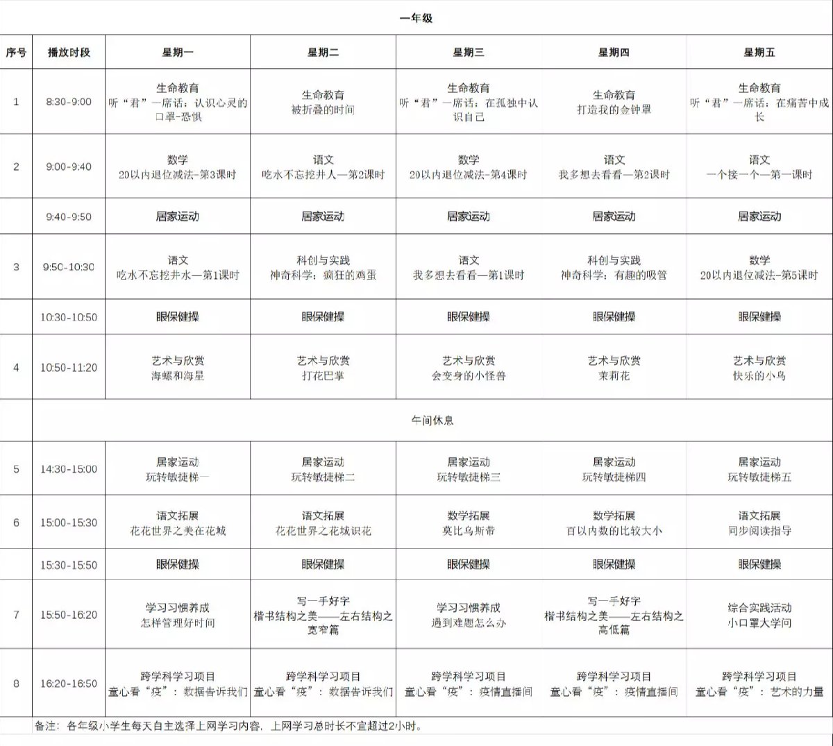 茂名粤课堂小学一年级课程表 广东小学一年级课程