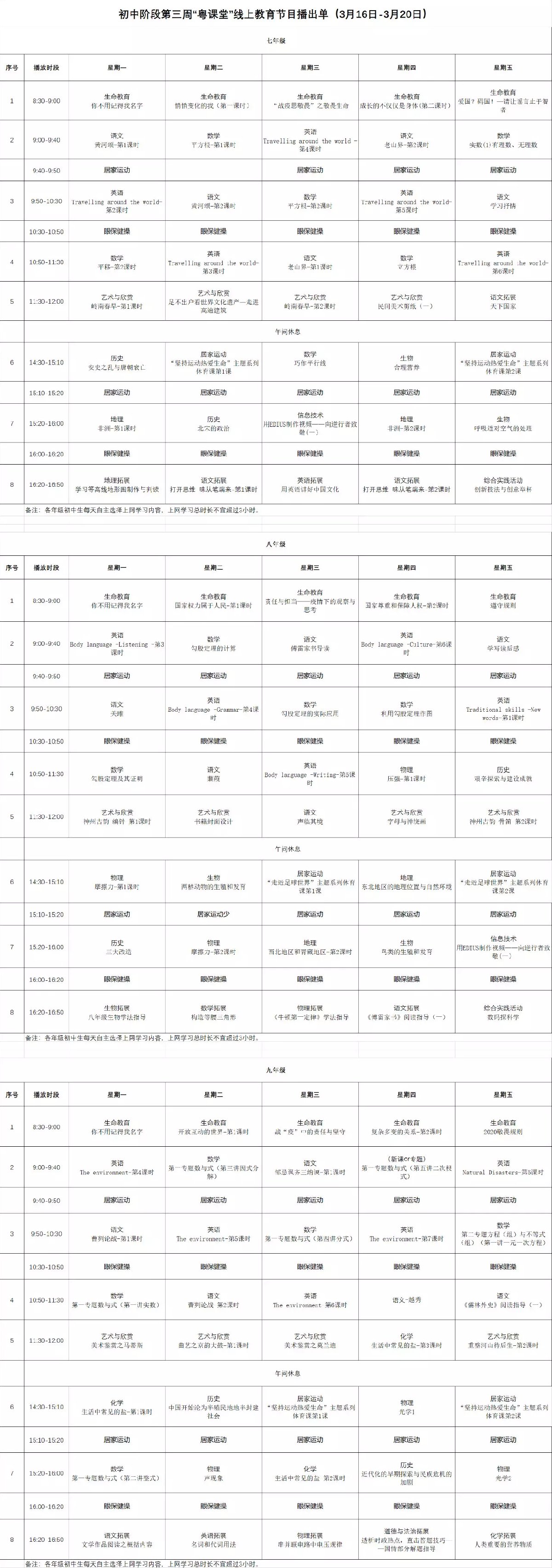 茂名粤课堂初中课程表 广东初中课程表时间安排