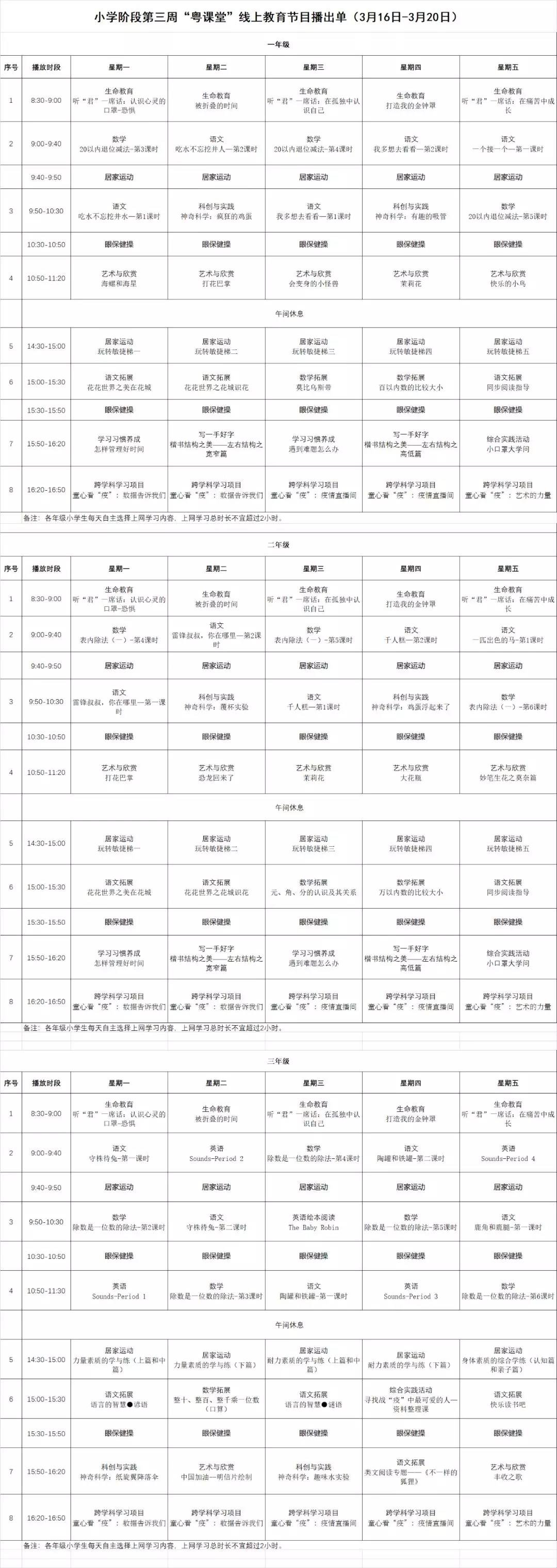 茂名粤课堂小学三年级课程表 广东小学课程表