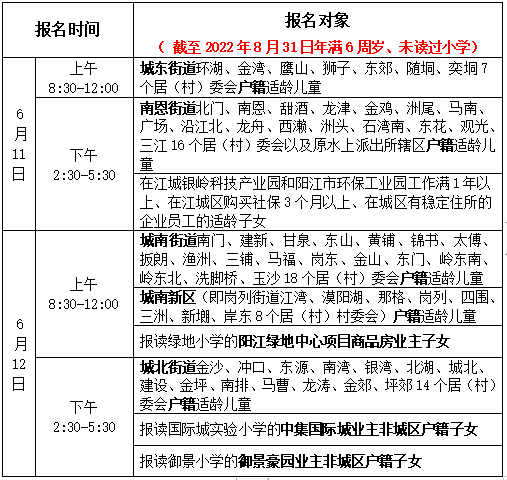 注意!非上述报名对象的家长不能进入报名现场。如需咨询,请直接拨打江城区城区公办学校一年级招生咨询电话2238812或2238299。