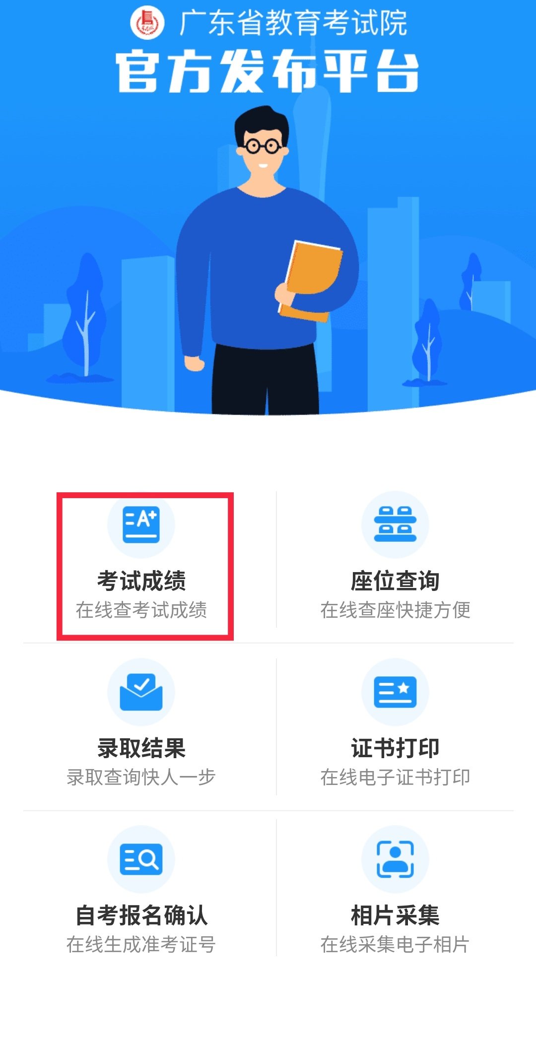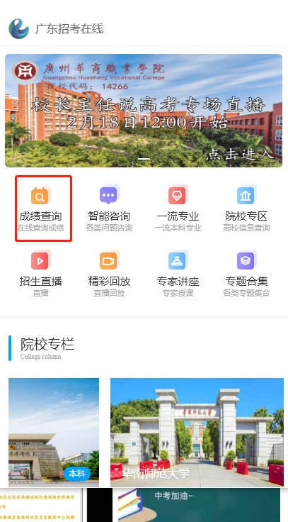 考生于2月18日10:00起,通过微信搜索进入“广东招考在线”小程序,点击“成绩查询”,选择考生对应的考试类别,通过考生号和出生日期查询考试成绩。